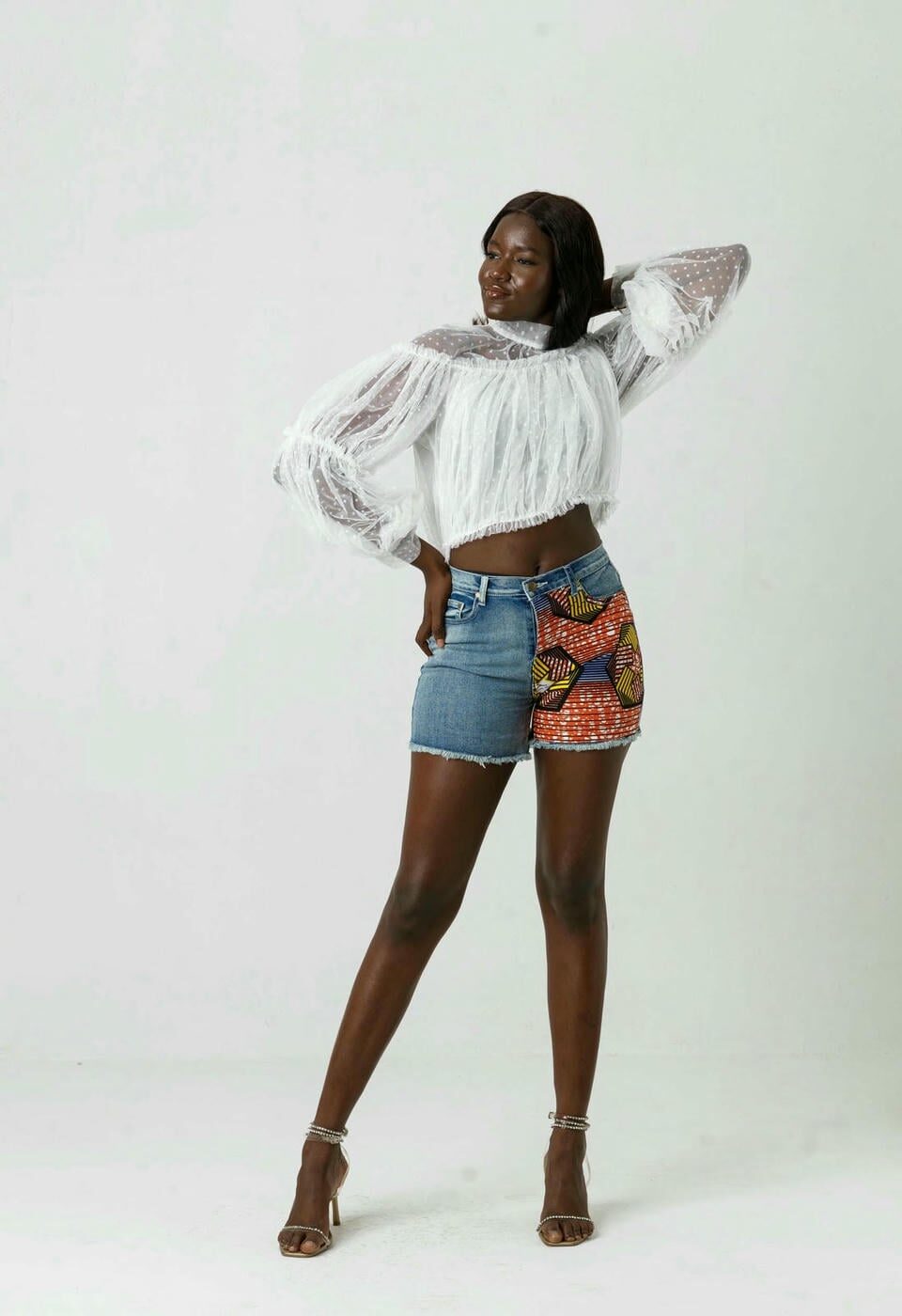 It’s the perfect combo ankara print fabric on our whisker washed Jeans.Mid Rise
